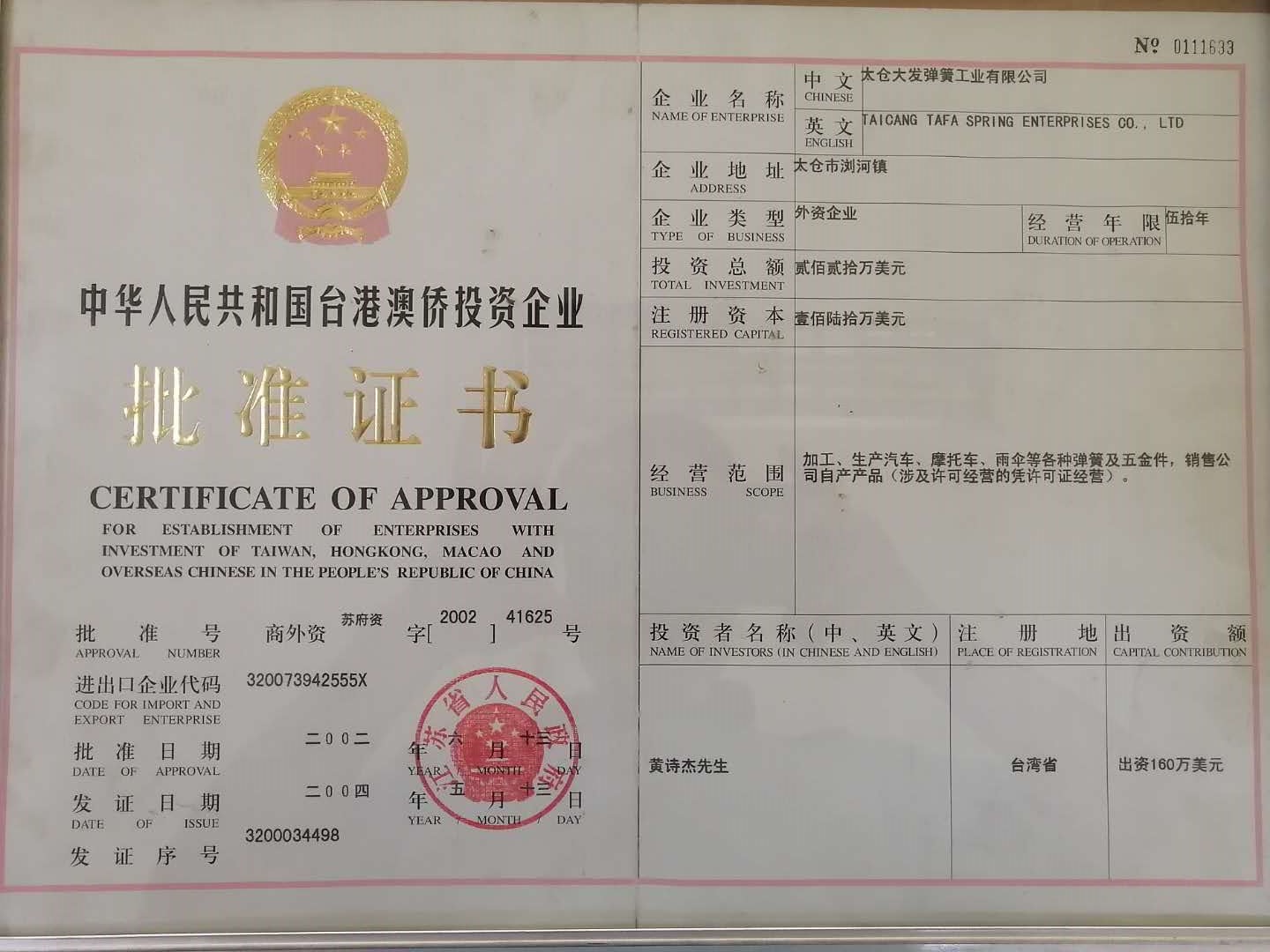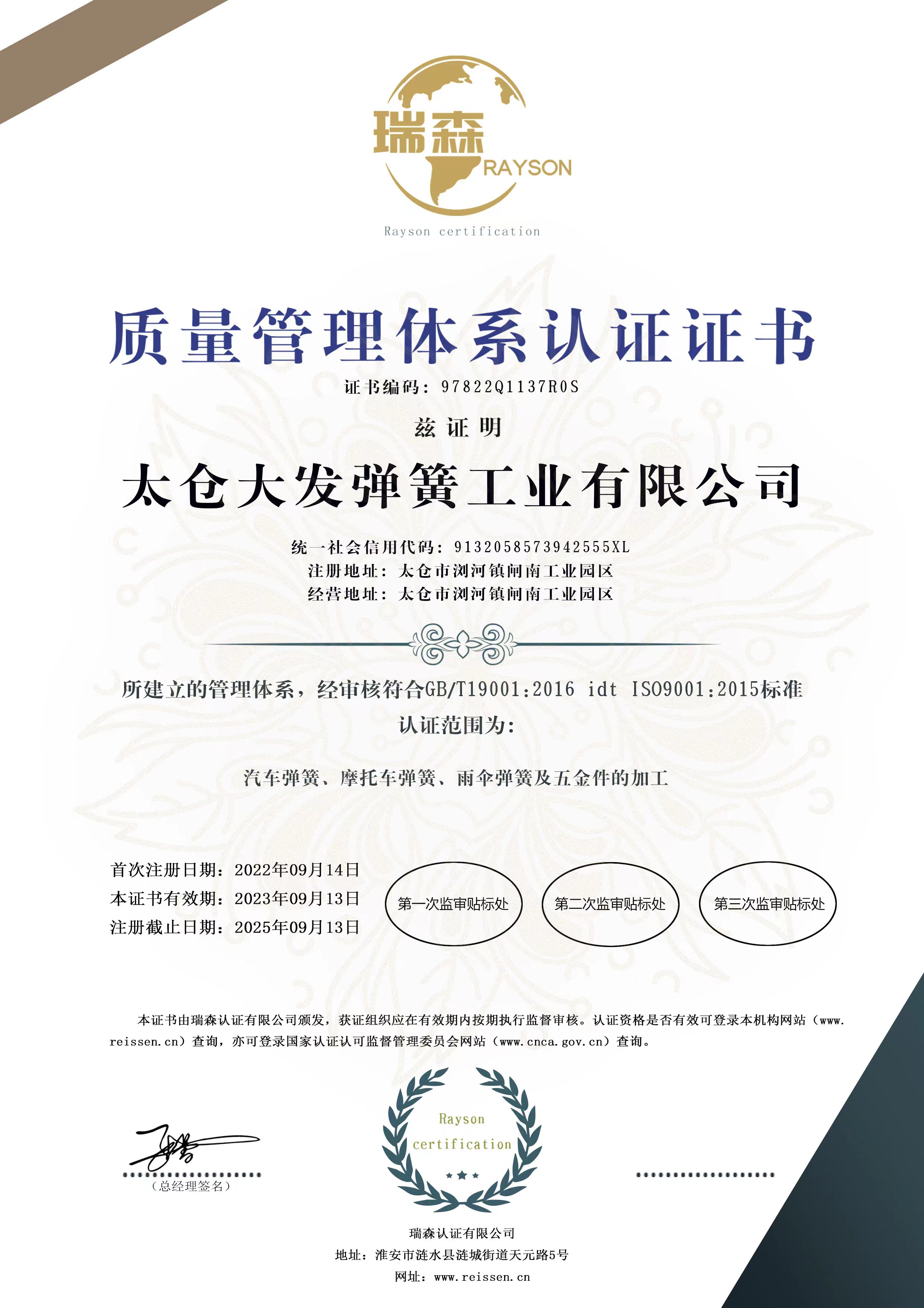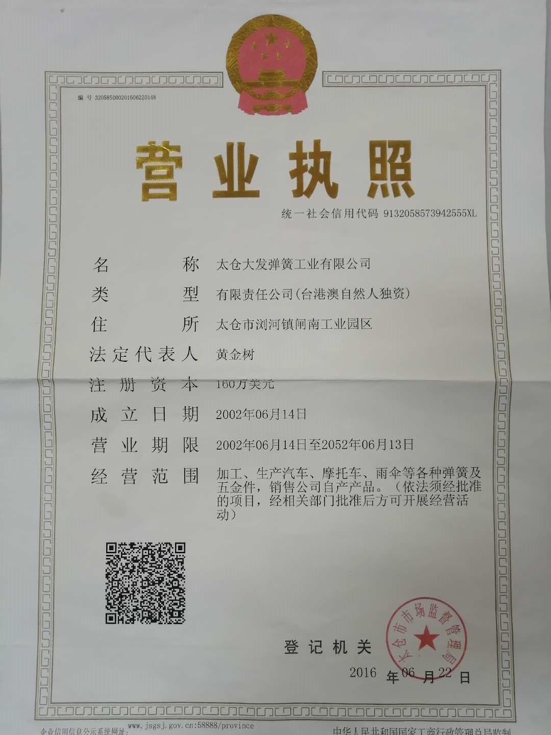 太倉大發(fā)彈簧工業(yè)有限公司由黃金樹先生于1967年始創(chuàng)于臺灣,是一個集雨傘、電子、五金機械、自行車、摩托車、汽車等的彈簧配件生產(chǎn)、加工、輔助設(shè)計服務(wù)的綜合性企業(yè),其中1990年創(chuàng)辦的廈門大發(fā)彈簧公司、2000年創(chuàng)辦的深圳大發(fā)彈簧公司、2002年創(chuàng)辦的太倉大發(fā)彈簧公司均位于經(jīng)濟發(fā)展地區(qū),地理位置佳。我們憑借在彈簧制造業(yè)的多年豐富知識與技術(shù),并著眼于以客戶為導(dǎo)向,秉持“以人為本,以質(zhì)為先,以客為主,持續(xù)創(chuàng)新”的經(jīng)營理念,強化競爭優(yōu)勢。公司導(dǎo)入ISO9001: 2000質(zhì)量管理體系,執(zhí)行ISO14000:2000管理方式,倡導(dǎo)安全、高質(zhì)量、高素質(zhì)的生產(chǎn)。
